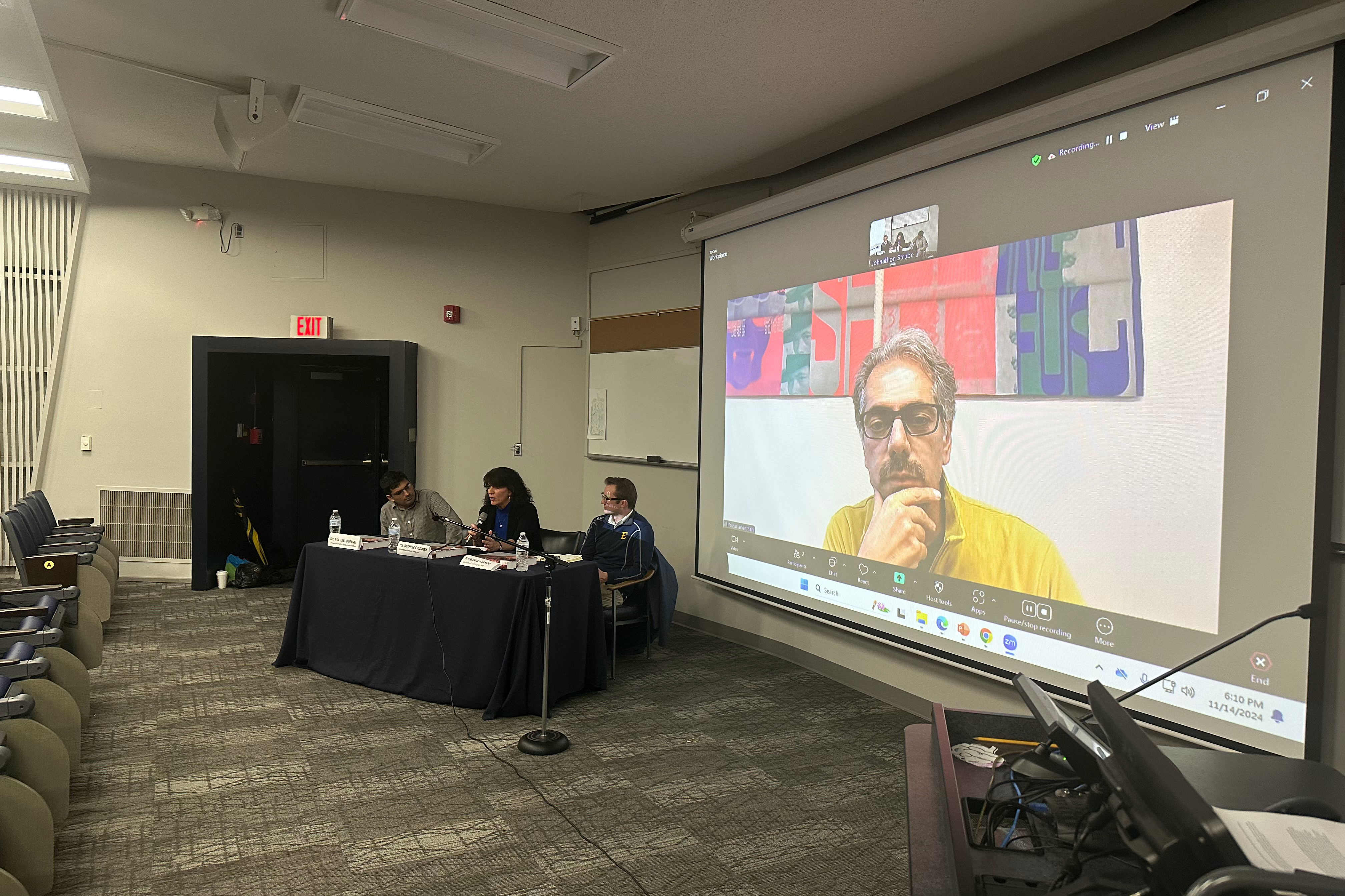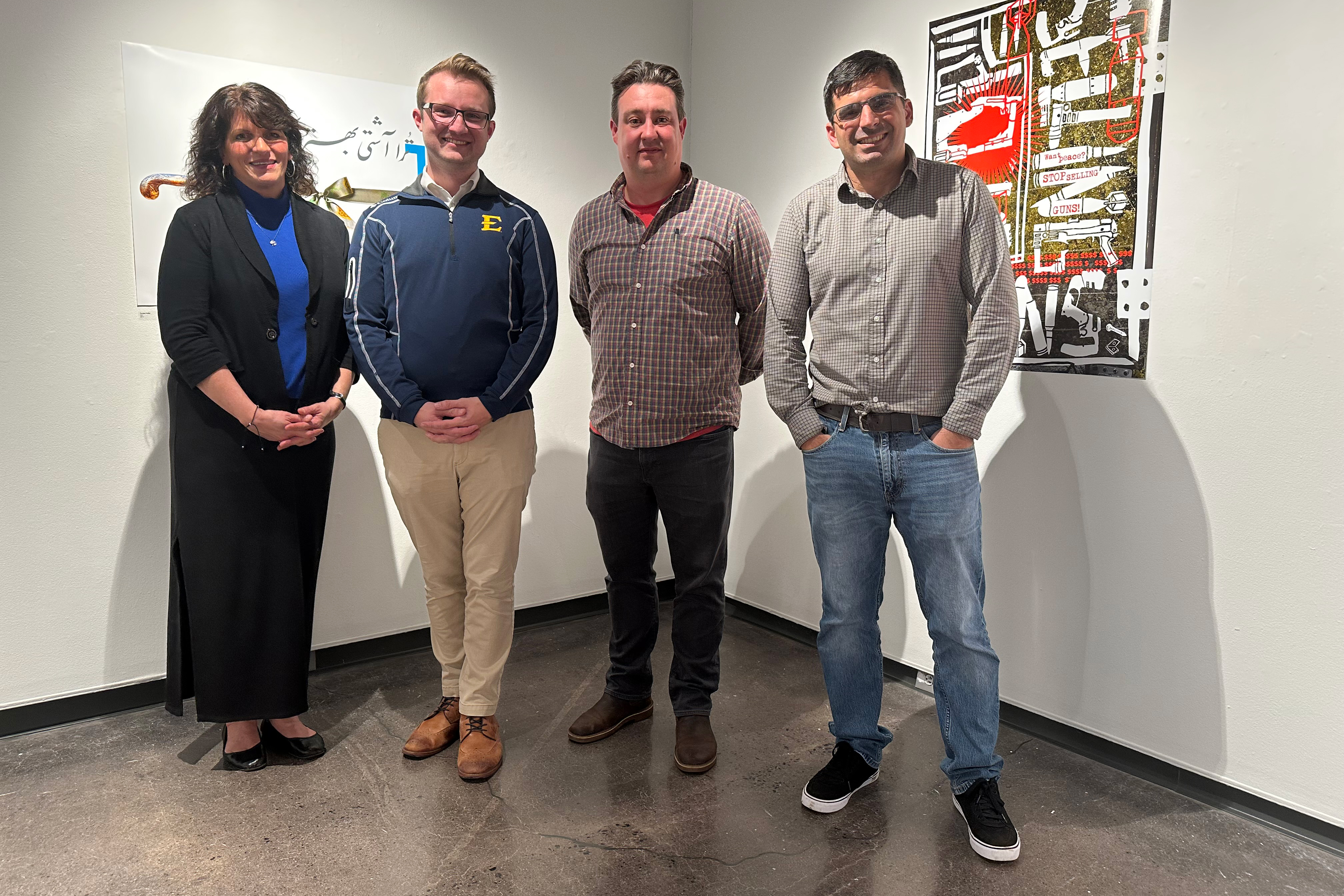 In response to this context, curator and ETSU Graphic Design Professor Johnathon Strube organized a community discussion as part of the opening at Slocumb Galleries to encourage voting amongst students and advocate for peace. This event presented the second Diverse Discussions round-table. The round-table panel brought together scholars from across ETSU to share their expertise and engage in a dialogue inspired by the visual arts—providing insight into the modern interpretation of peace and related topics challenging society and culture.