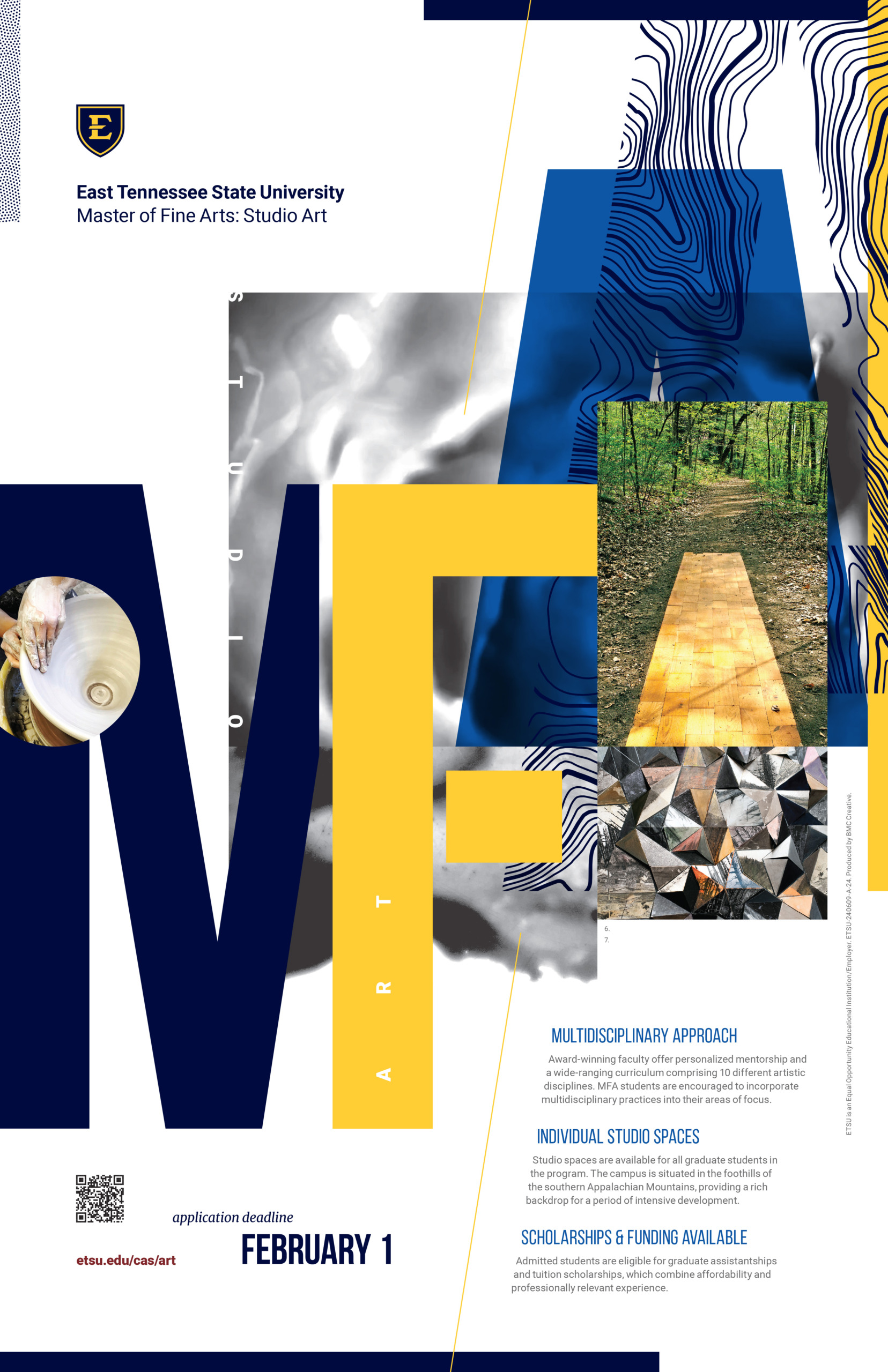 The visual concept focused on the multidisciplinary approach fostered in the program. The assemblage of materials, mediums, and practice defines the experience of the the MFA candidate at ETSU—featuring award-winning faculty and 10 different art or design disciplines. Likewise, it emphasizes the uniqueness of context, place, and community. through curated alumni visuals.